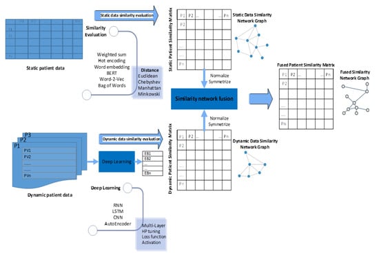 This modification distinctly indicated the strength of similarity between each pair of patients and reduced the noise and interference that can be attributed to the similarity of other patients. This integrated matrix, which was obtained from the sequential operations, produced a PSN defined as a graph G = (V, E). The vertex V represents the patient set S, and the edges are weighted by the similarity level between the patients. The edge weights were denoted as a similarity matrix resulted from the final iteration of the SNF algorithm, as explained earlier, where each element indicates the similarity level between patients and. Figure 4 shows the key processes associated with the building of a hybrid PSN, including static, dynamic, and fused similarity matrix constructions, as per the formal description.