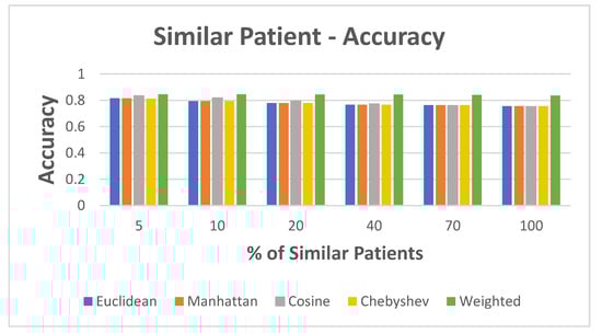 Intelligent self-learning electronic medical record (ISLEMR) [27] is based on a PSN and considers the principal diagnosis as the similarity assessment input. It can provide treatment plan recommendations and can help in training inexperienced doctors. Patients and have principal diagnoses and , respectively, and the similarity is 1 when is the same as , and when they differ, the similarity is 0. In EASY MODE, patients with the same principal diagnosis as the target patient constitute the most similar patient group. In MIXED MODE similarity, patients’ demographic data, vital signs, and structured lab test results are considered and, in COMPLEX MODE, the dissimilarity matrix is obtained after a series of steps. Initially, all the objects are apart, forming a small cluster by itself. The two most similar objects are combined to form a new cluster and a new dissimilarity matrix is computed. This process is repeated until all objects are reallocated into two clusters.