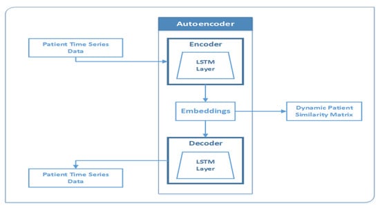 Choosing LSTM in our autoencoder model facilitated the feature reduction process to learn from the temporal relationships among time-series features, instead of implementing a feature reduction process that flattened all the time-series features and lost the temporal information contained in the set of features. We first trained our dataset utilizing a reconstruction autoencoder model to reduce the size from 20,680 to 4046 rows with 5D embeddings each. Choosing 5D embeddings produced good accuracy results when training. The proposed model used a batch of series of patient exam records as input and output (1 × 5) vectors that is the final hidden state. We used the rectified linear activation function (ReLU) in our LSTM model and the loss values were calculated based on the mean square error (MSE). In our model, LSTM was a gated RNN with an input vector, which is the dynamic part vector of the patient’s set.