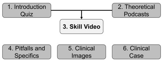 Didactic structure of an organ chapter in the online courses. To teach organ-specific examination techniques, the chapters are composed with similar didactic elements. Initially, an introduction quiz (1) is supposed to activate and self-assess pre-existing knowledge on instruments and anatomy/physiology, afterwards depending on a student‘s demand, theoretical podcasts (2) on anatomy/physiology as well as an instrument gallery are provided and leads to the central video (3) presenting organ-centered examination skills. Thereafter, galleries on pitfalls and specifics of the examination technique (4), a gallery presenting clinical images (5), and a clinical case (6) utilizing the presented examination techniques are supposed to deepen the background and understanding of the organ-specific examination.