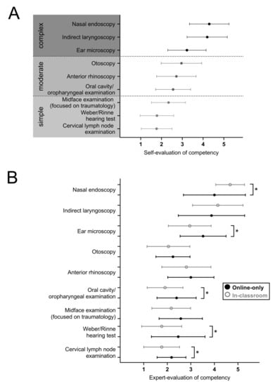 Overall self-evaluation of examination competency and comparison of expert-assessment of examination skills. (A) Self-evaluation of skill competency for 9 different ENT examination items is shown. Data are based on all participants irrespective of previous mode of training. Examination items are grouped into simple, moderate and complex tasks. (B) Expert-evaluated ratings of competencies in different examination items is shown, comparing participants who received in-classroom-teaching vs. online-only teaching. Self-/expert-evaluation is measured on a 5-point interval scale (Likert scale; 1 = high proficiency to 5 = low proficiency); * p < 0.05.
