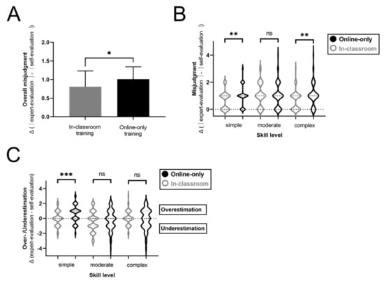 Comparison of overall misjudgment and over-/underestimation of own skills after in-classroom vs. online-only teaching. (A) Global overall misjudgment calculated as the difference of expert-evaluation and self-evaluation of skills irrespective of direction of potential misjudgment is compared in in-classroom vs. online-only cohorts. One global value per participant was used. (B) Misjudgment levels as calculated under (A) are shown, subdivided into respective skill levels. (C) Detailed analysis of over-/underestimation in different skill levels is depicted (overestimation > 0, underestimation < 0). * p < 0.05; ** p < 0.005; *** p < 0.0005; ns p > 0.05 (not significant).