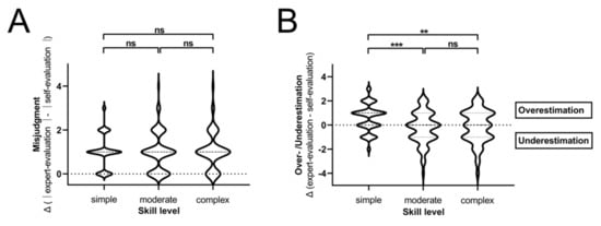 Comparison of global misjudgment and over-/underestimation in online-only cohort. (A) Results of misjudgment calculation in the online-only cohort are represented as violin plots subdivided into skill levels. (B) Levels of over- and underestimation in different skill levels in the online-only cohort are shown. ** p < 0.005; *** p < 0.0005; ns p > 0.05 (not significant).