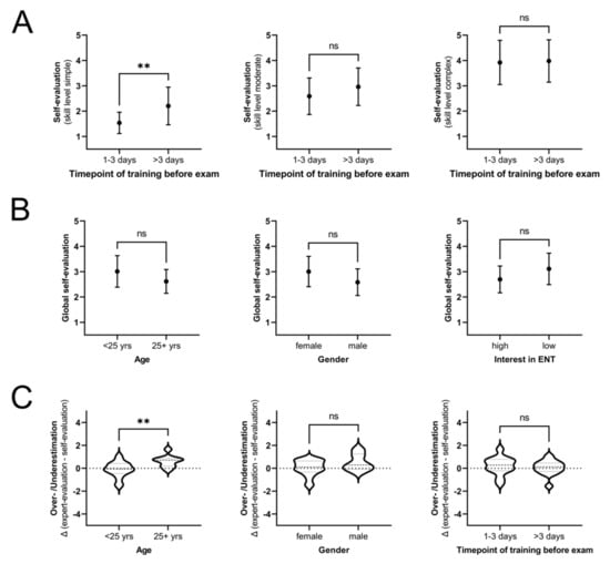 Comparison of self-evaluation and over/-underestimation in different subgroups. (A) Self-evaluation in different skill levels; timepoint of completion of the online training was used to define subgroups. (B) Global self-evaluation in different subgroups according to age, gender and interest in ENT is shown. (C) Global over- and underestimation is compared in age groups < 25 years and 25+ years, female vs. male and in subgroups according to completion of online training. ** p < 0.005; ns p > 0.05 (not significant).