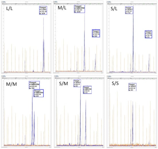 Electropherograms of six different Variable number tandem repeat polymorphisms (pVNTR) CYP2C9 diplotypes found in the studied population (S: 419–431 bp; M: 446–487 bp; L: 510–517 bp).