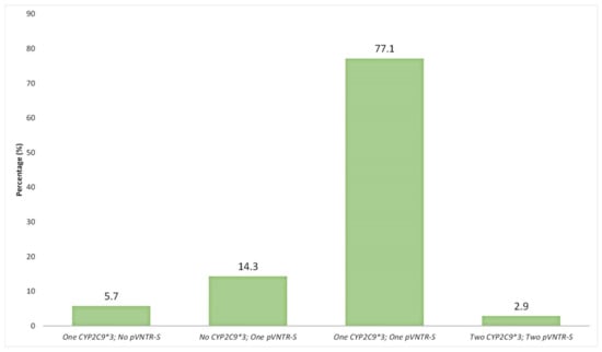In addition, 27/35 individuals in the Spanish population, carrying pVNTR-S and/or CYP2C9*3 variants, carried both polymorphisms, either in heterozygosity (77.1%) or in homozygosis (2.9%) (Figure 2). In contrast, only five individuals who presented with the pVNTR-S variant did not have the CYP2C9*3 variant (14.3%), as well as two CYP2C9*3 carrier individuals (5.7%) (Figure 2).