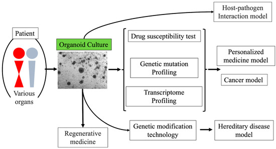 Applications of patient-derived organoids. Organoids have various potential applications in regenerative medicine, host-pathogen interaction models, hereditary disease models, and cancer models.