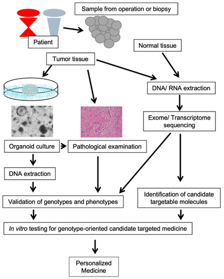 Personalized medicine is a therapeutic approach based on a patient’s genomic profile, environmental conditions, and lifestyle. Ideally, personalized cancer treatment should be guided by the genomic profile of the patient’s tumor. Based on their properties, organoids established from resected tumors of patients are conceivably very useful in designing personalized medicine because they reflect in vivo properties of the primary tumor and allow in vitro biochemical testing. However, there are limited reports on the successful establishment of a personalized medicine system that combines comprehensive genotyping and organoid culture.