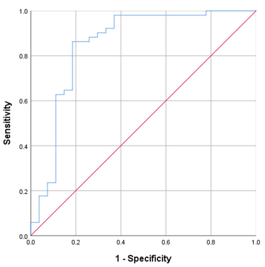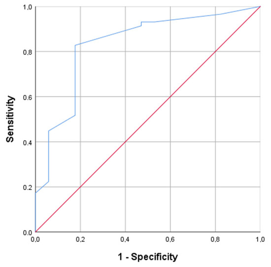According to the results of pituitary MRI, 77 patients had non-invasive adenoma growth. Of these, 60 of them had remission and 17 had persistence of hypercortisolism. We performed the ROC analysis for detecting the optimal cutoff point of the pituitary adenoma size for predicting CD remission after TSS. According to its results, the optimal cutoff of corticotropinoma size was ≥3 mm, with the sensitivity 82.8% and the specificity 82.4% (p < 0.001, AUC = 0.832, 95% CI = 71.5–94.8%); see Figure 1.