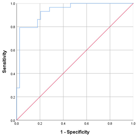 The 24 h MSeC was tested in 101 patients; 63 had remission and 38 had persistence of hypercortisolism one year after TSS. The 24 h MSeC was lower in patients with CD remission: 44.1 nmol/L [23.35; 98.85] (2.5–1397) vs. 466.3 nmol/L [399.2; 619.5] (51.29–1649) (p < 0.001). According to the ROC analysis, the optimal threshold of 24 h MseC for predicting CD remission was ≤388 nmol/L. The sensitivity and specificity of the method were 97.4% and 79.3%, respectively (p < 0.001, AUC = 0.935, 95% CI = 87.7–99.2%); see Figure 3.
