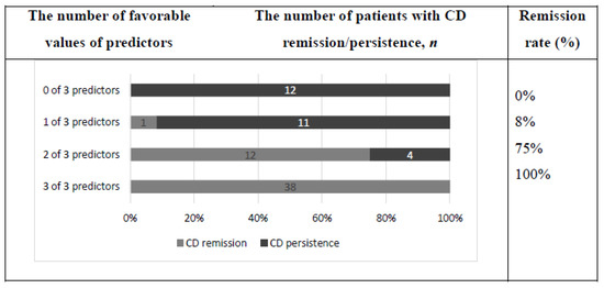 The values for all three identified predictors were obtained in 78 patients. A total of 38 out of 78 patients had favorable values of all three defined predictors of CD remission after TSS, 16 had two favorable values of predictors and 12 had one favorable value of predictors. In 12 patients, favorable values of defined predictors were absent. Remission rate, depending on the number of favorable values of defined predictors of CD remission after TSS, is presented in the Figure 4.