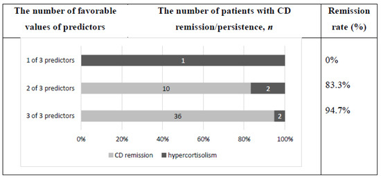 Patients with CD remission one year after TSS underwent a long-term follow-up. The median of the follow-up period was 41.2 months [20.5; 79.2] (15–127). Hypercortisolism relapsed in 5 (7.9%) out of 63 patients. The remission rate in the long-term follow-up group depended on the number of favorable values of CD remission predictors after TSS; see Figure 5.