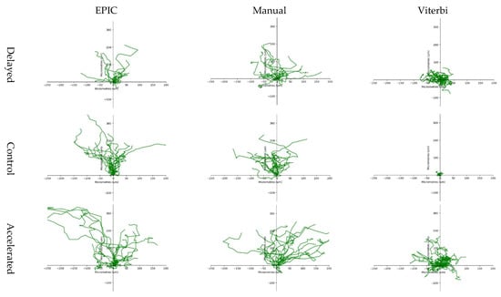 Cell trajectories of the leading edge cells tracked using manual cell tracking, EPIC and Viterbi in a delayed, control and accelerated experiment. Cell trajectories generated using manual cell tracking and EPIC indicate that cells primarily migrated in a positive vertical direction towards the wound region. In contrast, cell trajectories generated using Viterbi do not resemble leading edge cell tracks, instead suggesting that cells moved in more dispersed horizontal and vertical directions, including away from the wound area, contradicting EPIC and manual cell trajectories.