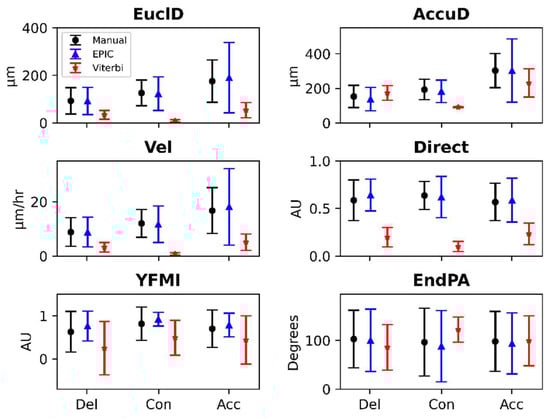 Cell migration metrics produced by manual cell tracking, EPIC and Viterbi. Various shapes and bars represent the mean and standard deviations, respectively, of cell migration metrics produced by manual (black circle), EPIC (blue triangle) and Viterbi (red star) cell tracking in delayed (Del), control (Con) or accelerated (Acc) experiments.