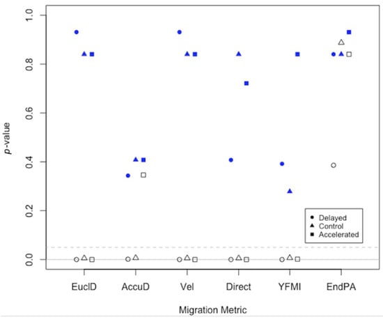 Comparison of the cell migration metrics produced by EPIC and Viterbi to manual cell tracking. Each symbol represents a p-value for pairwise comparisons of the sampled cell tracks from EPIC and manual cell tracking (blue filled) and Viterbi and manual cell tracking (black empty) for the delayed, control and accelerated experiments. We performed pairwise comparisons using two-sample Wilcoxon–Mann–Whitney tests. The statistical significance level was set to p < 0.05 (indicated by the dashed grey line). The solid grey line indicates y = 0. Metrics are shown in the following order and are abbreviated for clarity in the figure: Euclidean distance, accumulated distance, velocity, directionality, Y-forward migration index and end point angle.