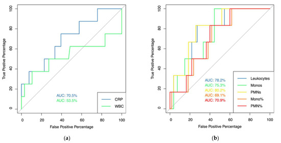 AUC Analysis. (a) AUC analysis for serum CRP (blue line) and peripheral blood WBC count (green line) in patients with chronic PJI; (b) AUC analysis for synovial fluid WBC count (blue line), monocyte cell count (green line), PMN cell count (yellow line), synovial percentage of monocytes (orange line), and percentage of PMN cell count (red line).