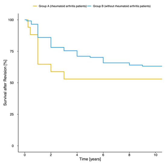 Risk for prosthesis failure due to recurrent PJI or aseptic loosening (Figure 2) was significantly elevated in patients with rheumatoid arthritis (prosthesis survival rate in group A: 78.07% versus group B: 52.94%; p = 0.03). Additionally, median prosthesis survival times were significantly shorter in group A (median: 1 year, IQR: 1.00–3.00 years) compared to group B (median: 2 years, IQR: 1.75–4.00 years; p = 0.05).