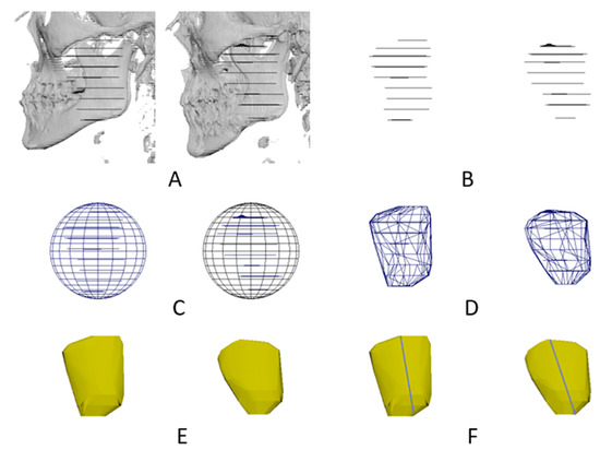 Surface reconstruction of a masseter muscle before (left) and after (right) a mandibular setback. The masseter muscle and skull were initially surface reconstructed. (A) Transparent skull revealing the initial surface models of the masseter muscle. (B) Initial surface models of the masseter muscle. (C) A polyhedron generated and (D) wrapped around the initial surface models of the masseter muscle. (E) Realistically and smoothly reconstructed surface model of the masseter muscle. (F) Length of the masseter muscle measured using a ruler.