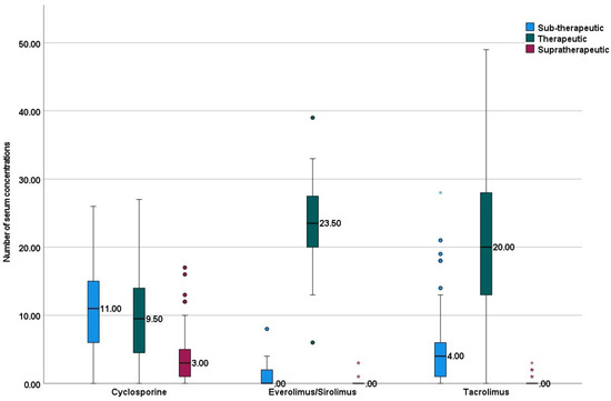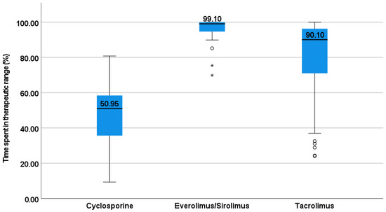 Median (range) of serum cyclosporine was 97 (19–592.5) ng/mL, everolimus/sirolimus was 5.2 (2–27.6) ng/mL, and tacrolimus was 7.1 (2–30) ng/mL. Median (range) number of concentrations in the sub-therapeutic range was significantly higher with cyclosporine {11 (0–26)} compared to tacrolimus {4 (0–28)}, and everolimus/sirolimus {0 (0–8)} (Figure 1). Median (range) time spent in therapeutic range 84 (24.1–100). Cyclosporine was observed with the least time spent in the therapeutic range; this was statistically significant, compared to other immunosuppressive drugs (Figure 2).
