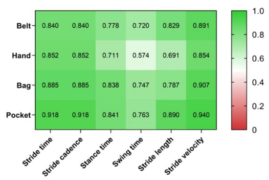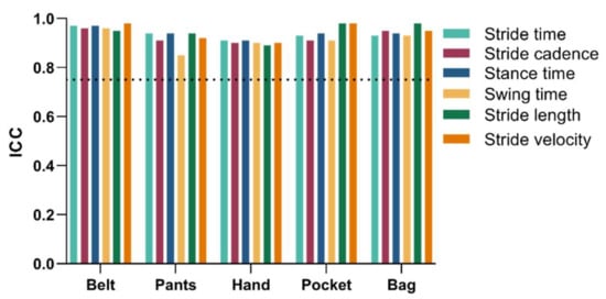 Relative reliability was calculated for each smartphone location: Belt, pants front pocket (Pants), hand, shirt pocket (Pocket) and shoulder bag (Bag). All calculated spatiotemporal gait metrics showed ICC values above or equal to 0.85 (Figure 1 and Table 3).