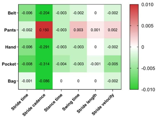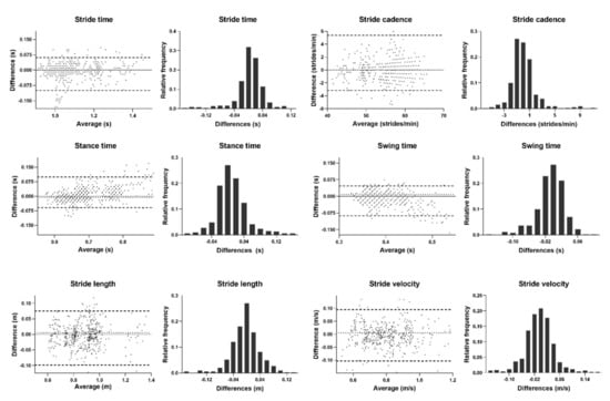 The relative values of LoA for the temporal metrics were consistent with its magnitude, i.e., the largest LoAs were observed for stride time, the lowest for swing and intermediate for stance. Unexpectedly, the smaller LoA values were observed for stride length regardless of device position. This is also associated with the outlier exclusion procedure. The stride length model that was used depends on the variance of the vertical component of the acceleration signal and on the stride frequency. Since an outlier removal step was used, most gait cycles have a standard pattern. This results in a consistent result for the stride length.