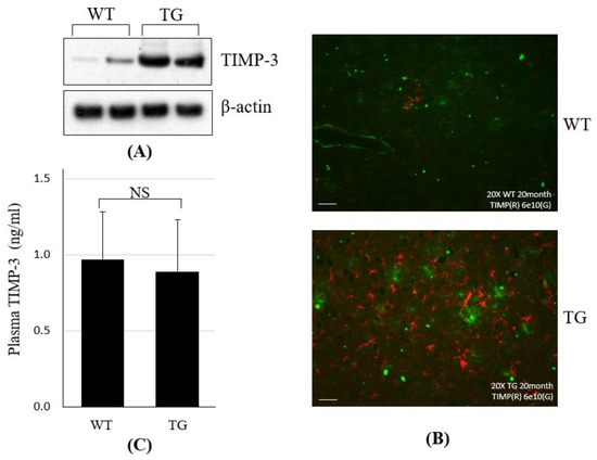 (A) Immunoblot analysis for TIMP-3 in the cerebral cortex of wild-type (WT) and APP Swedish/PS1dE9 transgenic (APP Tg) mice. β-actin was used as a loading control. (B) Detection of TIMP-3 in the parietal cortex of AD mice brains. Immunostainings of anti-TIMP-3 (Red) and anti-Aβ1-42 (Green) in the brain of WT and APP Tg mice (scale bar = 50 μm). (C) The plasma TIMP-3 levels of WT (n = 4) and TG (n = 4) were measured by ELISA assay. Each value is presented as the mean ± SD. TG, Transgenic; NS, not significant; TIMP-3, Tissue inhibitor of metalloproteinase-3; SD, Standard deviation.