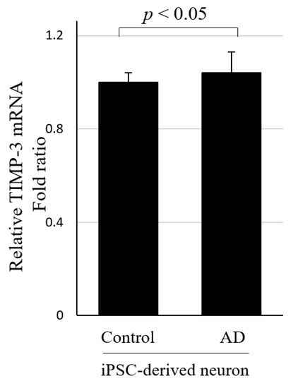 We then examined the TIMP-3 expression in human iPSC-derived neuronal cells from AD patients. Once the cells were differentiated to neurons, the TIMP-3 mRNA levels were slightly increased in AD patients compared with healthy controls (Figure 2).