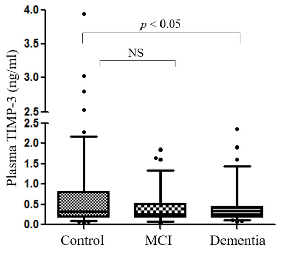 Analysis of TIMP-3 levels in human plasma. Plasma TIMP-3 concentrations were measured by ELISA. The differences in the relative amounts of TIMP-3 were compared between dementia, MCI, and controls using the Mann-Whitney U-test within different groups. NS = not significant.