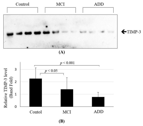 (A) Levels of TIMP-3 in human CSF were estimated by immunoblot analysis. The CSF from healthy control (n = 10), MCI (n = 10), and ADD (n = 10) w probed with an anti-TIMP-3 antibody. (B) Relative expression levels of TIMP-3 are represented as mean ± SD, and statistical significance is indicated by p < 0.05 and p < 0.001. Mild cognitive impairment (MCI); Alzheimer’s Disease Dementia (ADD).