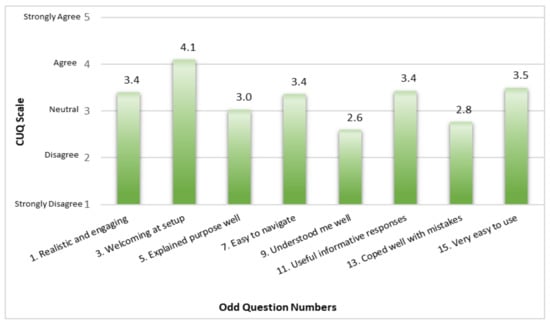 The odd question numbers of the CUQ have statements that relate to the positive aspects of the chatbot. On a scale of 1—Strongly Disagree to 5—Strongly Agree to the positive statements about MYA’s usability, Question 3, which states ‘The chatbot was welcoming during initial setup’ had the highest average ranking of 4.1 corresponding to Agree. The lowest average ranking was 2.6 for Question 9 which states ‘The chatbot understood me well’ (See Figure 1).