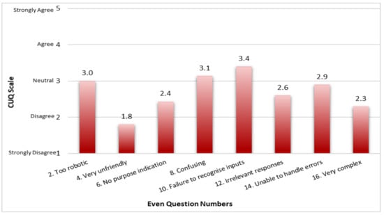 In Figure 2, the average ranking on a scale of 1—Strongly Disagree to 5—Strongly Agree of the CUQ even question numbers with statements related to the negative aspects of the chatbot are shown. Question 10, which states ‘The chatbot failed to recognize a lot of my inputs’ had the highest average ranking of 3.4. With an average ranking of 1.8, Question 4, which states ‘The chatbot seemed very unfriendly’ had the lowest ranking.