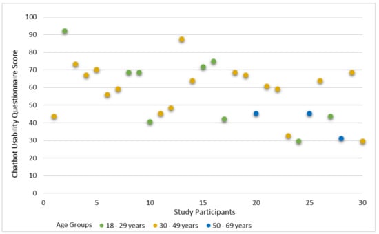 Of the 30 study participants, 9 used the Telegram desktop app and 21 used the Telegram mobile app. A total of 12 out of the 21 Telegram mobile app users used an Android phone, 7 used an iPhone, and 2 did not specify the type of phone used to chat with MYA. Participants who used the Telegram desktop app had a mean CUQ score of 52.6 and a median score of 43.8 (range 29.7–92.2).