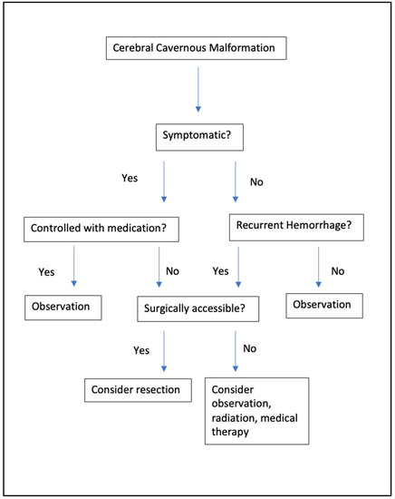 Surgical intervention is the first treatment option for accessible supratentorial lesions causing uncontrolled seizures or symptomatic lesions due to recurrent hemorrhage or mass effect (Figure 3). Resection mitigates any further risk of hemorrhage and permanent neurologic deficits in addition to seizure improvement in 80% of cases [13,22]. Supratentorial lesions that are cortically-based, supratentorial, symptomatic, or have bled are favorable for resection and have a high likelihood of successful symptomatic improvement and seizure control [1,22,23]. Surgical resection is especially beneficial in patients whose seizure-onset is acute and caused specifically by the lesion [22,24]. Symptoms due to mass effect from acute hemorrhage noted on neurological examination are likely to improve over time regardless of treatment modality, but lesions that present with recurrent hemorrhage should be resected to prevent progressive and permanent neurologic deficits [1,2]. This must be taken in the context of the cumulative risk of hemorrhage over time, which is higher in the immediate post-hemorrhage period but returns to baseline after 2–3 years [17].