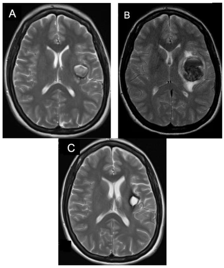 Operative Symptomatic Supratentorial CCM. T2 axial MRI of a patient with an enlarging hemorrhagic left insula CCM initially presenting with word finding difficulties and right sided weakness (A). The CCM was found to have enlarged over the next three months (B). The patient underwent surgical resection she experienced almost immediate resolution of her symptoms with T2 MRI imaging three months after surgery showing complete resection (C).