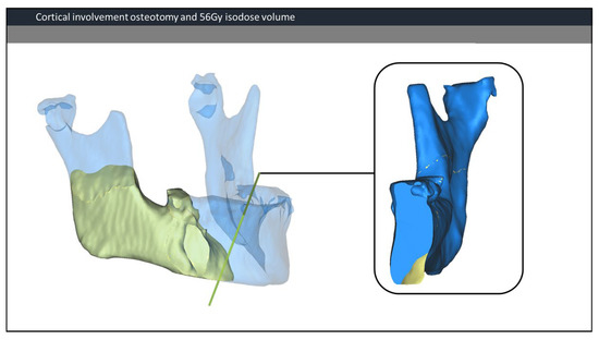 Cortical involvement osteotomy and 56 Gy isodose volume. On the left, an overview of the mandible and the 56 Gy isodose volume (yellow). The osteotomy plane is visualized in green. On the right side, a view perpendicular to the osteotomy plane. In this case, only the lingual cortex is involved.