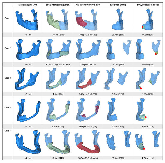 Overview of patients with recurrence of ORN after segmental resection. The first column illustrates the 3D segmentation of the mandible during radiotherapy, representing the total mandibular volume (Vm). The second column illustrates, in yellow, the volume of the mandible inside the 56 Gy isodose (Vm56). The third column, in red, represents the volume of the mandible inside the PTV (Vm-PTV). The forth column shows the postoperative situation after segmental resection (VmR). The last column shows the residual volume of Vm56 after resection surgery (Vm56R). The red dots in the last column indicate the location of the ORN recurrence.