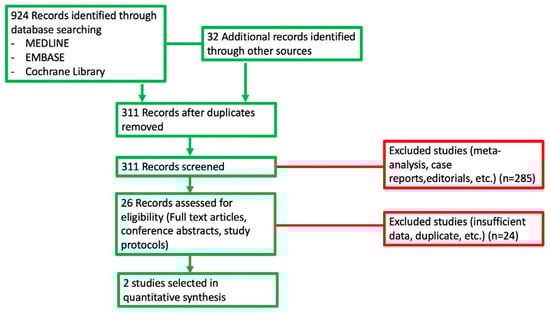 In our search, we found 956 potentially relevant reports, which were subsequently restricted to 2 [26,27]. We excluded 954 records as non-pertinent reports, as shown in Figure 1.