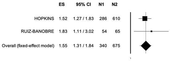 Forest plot of comparison between urothelial carcinoma patients receiving immune checkpoint inhibitors with concomitant PPIs use (N1) or not (N2); the outcome was Hazard Ratio of Overall Survival. Abbreviations: CI: confidence interval; ES: Effect Size.