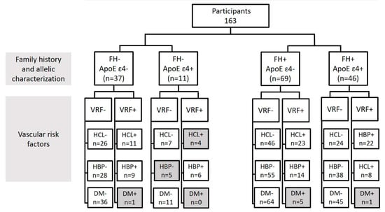 Flow chart of the subjects included in the study according to the different characteristics. (FH, family history; ApoE, apolipoprotein E; VRF, vascular risk factors, HCL, hypercholesterolemia, HBP, high blood pressure; and DM, diabetes mellitus). In gray, the groups discarded for having an n < 6 are shown.