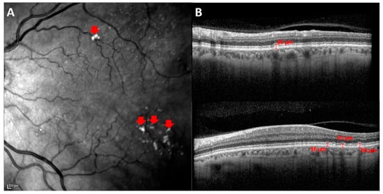 Analysis of drusen by OCT. (A) HRA fundus image. The red arrows show hyperreflective shapes. (B) Cross-sectional OCT scans showing drusen measurements in µm. This accumulation of hyperreflective material is located between the basal lamina of the RPE and the inner collagen layer of Bruch’s membrane.