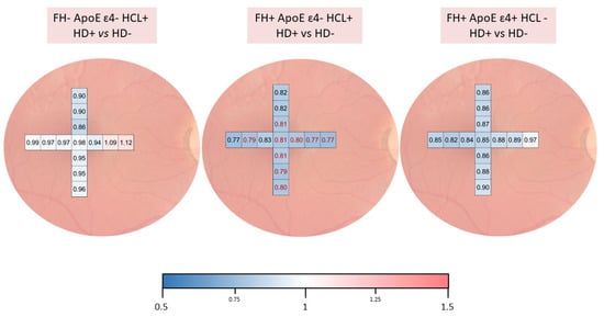 Colorimetric representation of choroidal thickness analysis at different points between participants with and without drusen in FH-ApoE ɛ4- HCL+, FH+ ApoE ɛ4- HCL+, and FH+ ApoE ɛ4+ HCL-. Thinning is shown in shades of blue, while thickening is shown in red tones.