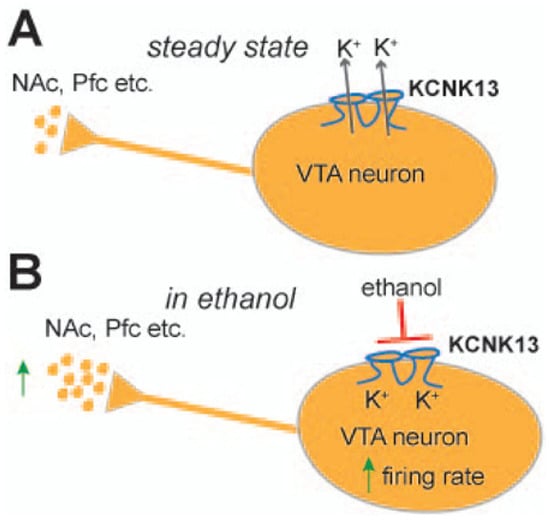 A schematic showing the steady state of VTA neurons (A) and how acute administration of ethanol stimulates VTA neurons by inhibiting KCNK13 (B); this molecule can modulate both VTA neuronal activity and binge drinking. KCNK13 is expressed in dopamine and non-dopamine neurons in the VTA. Kcnk13 gene expression is upregulated by acute alcohol consumption (Reproduced with permission from []).