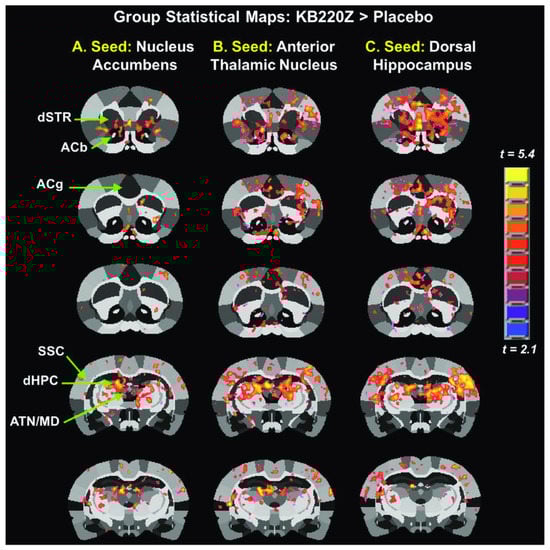 It is noteworthy that alterations in synchronous neural activity between brain regions subserving reward and other cognitive functions may significantly contribute to AUD. Febo et al. [] presented the first evidence that, in comparison to a placebo group, a pro-dopaminergic nutraceutical (KB220Z) significantly enhanced functional connectivity between reward and cognitive brain regions in the rodent model, including the NAc, hippocampus, anterior cingulate gyrus, anterior thalamic nuclei, prelimbic and infralimbic loci. Increased brain connectivity recruitment (i.e., axonal and spines’ neuroplasticity) and dopaminergic functionality were found across the brain reward circuitry. Importantly, increases in functional connectivity were specific to these regions and were not broadly distributed across the brain (Figure 2). This is important because studies on alcohol and drug effects in naïve rodents show reductions in functional connectivity after protracted withdrawal [].