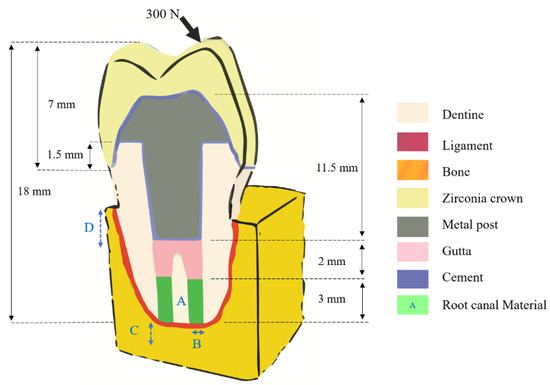 - Jang, Y.; Hong, H.-T.; Roh, B.-D.; Chun, H.-J. Influence of Apical Root Resection on the Biomechanical Response of a Single-rooted Tooth: A 3-dimensional Finite Element Analysis. J. Endod. 2014, 40, 1489–1493. [Google Scholar] [CrossRef]