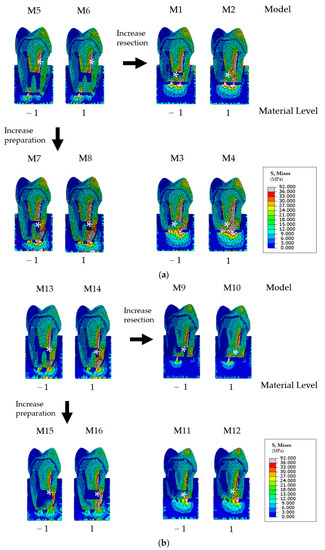 where 0 is the mean overall response, [1,2,3,4] are the main effects of factors [1,2,3,4] on the response; [12,23,24,34,13,14] are the interactions between factors of order 1; [123,234,124,134] are the interactions of order 2; and a1234 are the interactions of order 3. Two extreme levels were defined for each factor and were encoded as [−1; +1]. In this way, the effect (resp. interaction) ai directly represents the von Mises stress variation when the factor (resp. interaction) varies from the mean value (encoded −1) to the upper bound (encoded +1). Regardless of the physical nature of each factor, it is possible to directly compare their effects ai on the von Mises stress. The Young’s modulus of the polymer-reinforced zinc oxide–eugenol cement and the Mineral Trioxide Aggregate (MTA), respectively, were used for −1 and +1 levels of the retro filling material [9,14] (Table 2).
