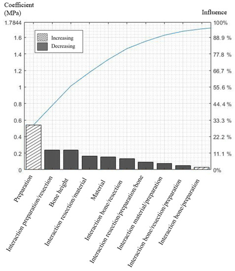An orthogonal array was created to model the 16 possible combinations depending on the level of each factor. A static explicit analysis was conducted to calculate the highest von Mises stresses for the 16 FE models. The FE models M1 to M8 report the stress values for a low level of bone, and models M9 to M16 report the values for a high level of bone (Table 3). The coefficients of Equation (1) were then defined by inversion of the orthogonal matrix, and the 10 most influential coefficients of Equation (1) were represented in descending order on a Pareto chart.