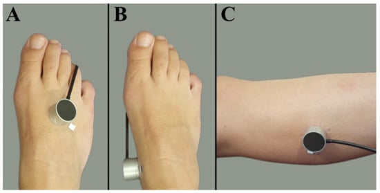 Measurement locations at the lower extremity. (A) Dorsal side of the foot. (B) Medial side of the foot. (C) Lateral side of the calf muscle 5 cm distally from the fibular head.