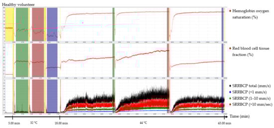 Jonasson et al. presented the first results in patients with diabetes mellitus and healthy individuals with an early prototype of the EPOS system [24]. They showed significant differences between healthy volunteers and patients with diabetes with and without microalbuminuria in low-speed (<1 mm/s) resolved RBC perfusion at 32 °C and 44 °C.