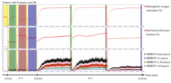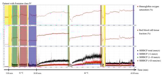 The output parameters of the EPOS system were HbSo2 (%), RBC tissue fraction (g RBC/100 g tissue or %), and speed-resolved RBC perfusion in percentage of RBCs times their speed in mm/s (% RBC × mm/s). The mean hemoglobin concentration per RBC was assumed to be 345 g/L [15]. Examples of the EPOS measurements in a healthy volunteer, a patient with Fontaine class IIb PAD, and a patient with Fontaine class IV PAD are shown in Figure 2, Figure 3 and Figure 4, respectively.