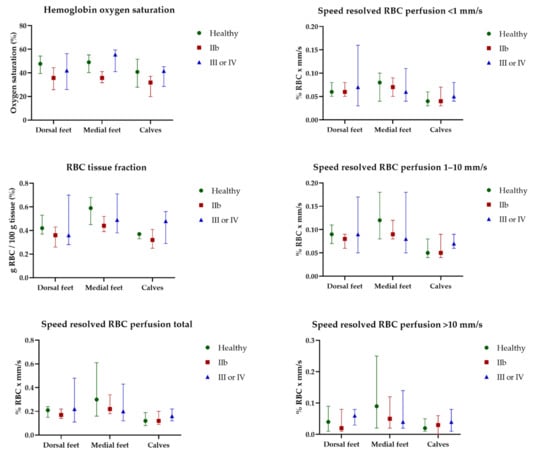 Continuous enhanced perfusion and oxygen saturation (EPOS) variables at 32 °C between healthy volunteers, patients with Fontaine class IIb, and patients with Fontaine class III or IV measured on the dorsal side of the foot, medial side of the foot, and the lateral side of the calf. Data are presented as median (interquartile range). Healthy: healthy volunteer, RBC: red blood cell, IIb: patients with Fontaine class IIb, IV: patients with Fontaine class III or IV.